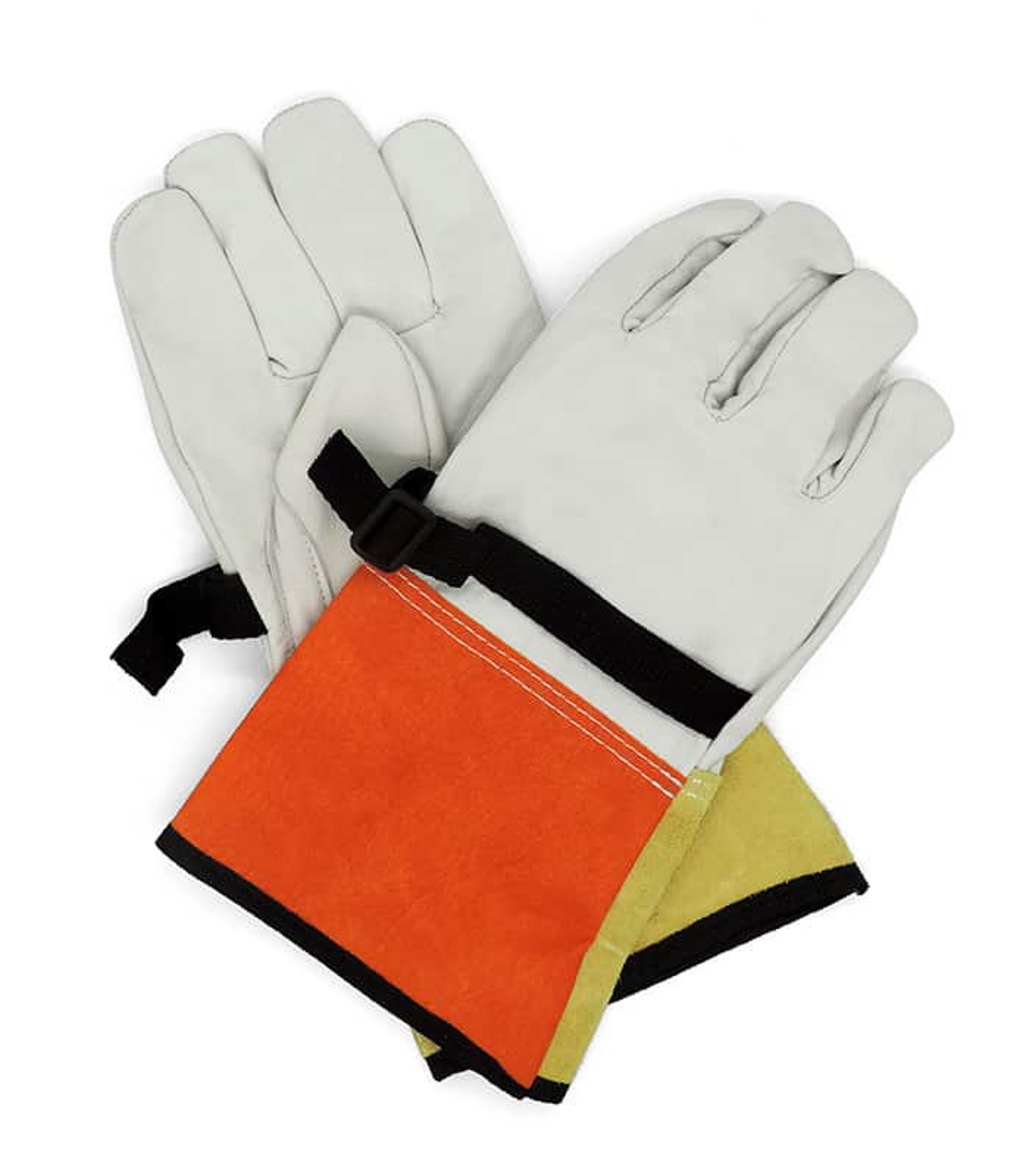 El guante de vaqueta dieléctrico con correa está hecho de cuero resistente, cuenta con puño largo tipo campana y correa de ajuste en la muñeca. Se usa como protección mecánica en trabajos eléctricos, colocándose sobre guantes dieléctricos de goma, ya que no ofrece protección directa contra la electricidad. Es ideal para maniobras con riesgo de cortes, abrasión o desgaste.